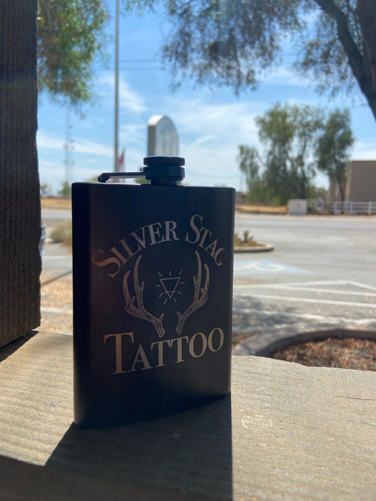 Stainless steel flask with silver stag logo etched in by local buckeye business